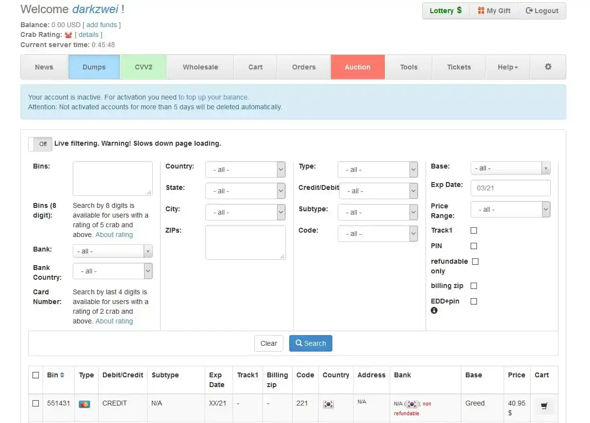 As with most carding shops, you need to register an account before you can access the market. But that is a one-step process and no additional information is needed, although you should provide a jabber account if you want to be able to reset your password at a later point. After you are registered your account will still be inactive until you deposit an initial balance. Note that inactive accounts will be automatically deleted after 5 days so make sure to deposit some money in time.