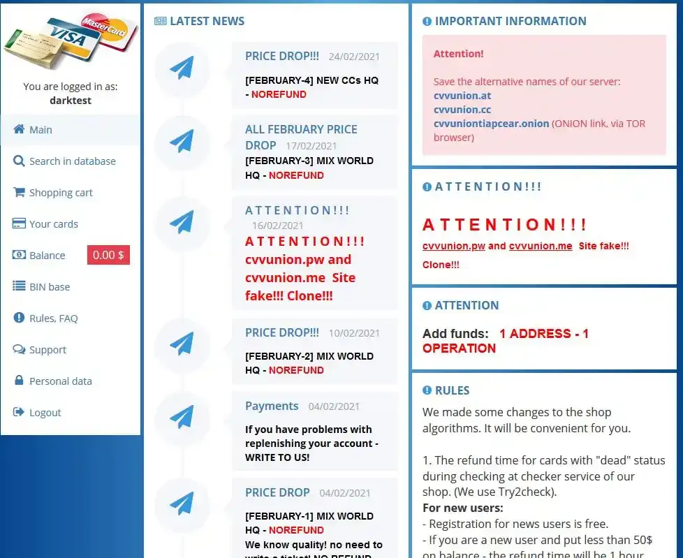CVV Union is a basic card shop that is ideal if you are looking for specifc card attributes. It features an extensive interface to the database which you can query with a lot of different parameters. You can find the onion link for the CVV Union card shop to the right of this article.