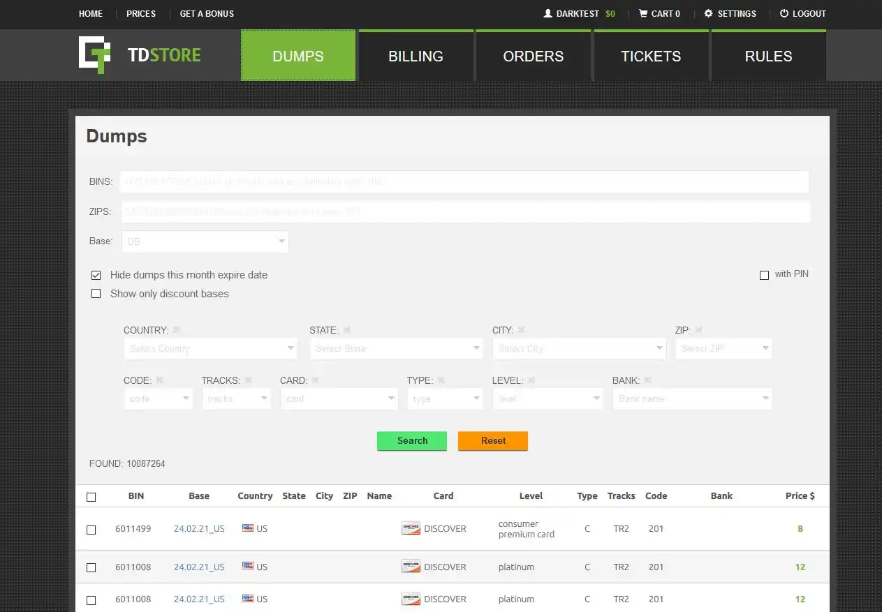 Trump’s Dumps – auch bekannt als TDStore – ist ein Kartenshop, der sich ausschließlich auf Kreditkarten-Dumps spezialisiert hat. Es gibt keine Möglichkeit, einzelne Karten oder andere digitale Produkte zu kaufen. Aber die Dump-Datenbank ist ziemlich groß, wird häufig aktualisiert und verfügt über erweiterte Suchfilter. Den Onion-Link für Trump’s Dumps finden Sie rechts in diesem Artikel.