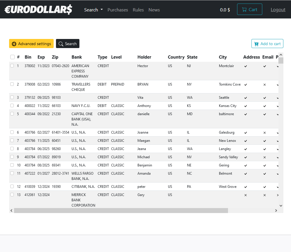 When clicking “advanced options” in the market view, it allows you to filter the cards according to your needs. You can search by Bin, ZIP, Bank, Crand, Type, Level, Country, State, Price as well as other personal information such as DOB/Email/Phone. Be aware that you need to charge your account before purchasing any cards. At the moment the only accepted currency on EuroDollars is Bitcoin and you cannot withdraw any funds after deposit – your wallet balance can only be used for purchases on the site.