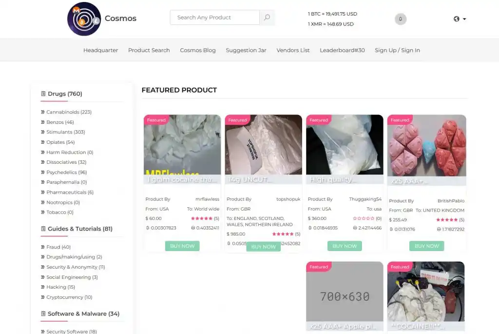 Cosmos Market offers dozens of different categories of products to choose from. You have the typical selection of drugs (Cannabinoids, Benzos, Stimulants, Opiates, Dissociatives, Psychedelics, Paraphernalia, Pharmaceuticals, Nootropics, Tobacco). But there is also a variety of digital products, from guides and tutorials to security software, exploits and botnets. And of course you’ll find the typical fraud related categories and a decent sized section for carding.