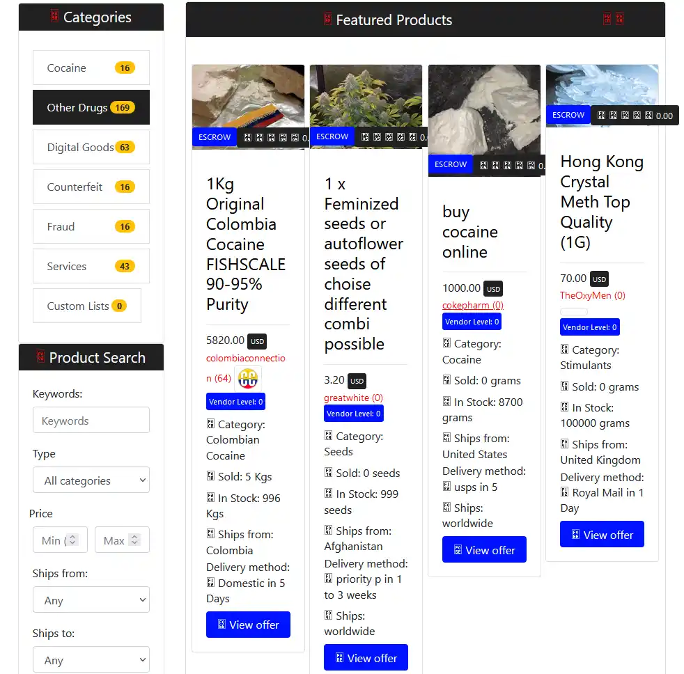 Colombia Connection is a small darknet vendor shop that specializes on cocaine but also lists some other drugs as well as digital goods. While the vendor only has a handful of categories (for instance, all drugs other than Cocaine are listed under the “other drugs” category), the site offers an extensive search feature which allows to search for product by type and keywords – a much quicker way to locate a certain product that browsing ythrough the categories manually.