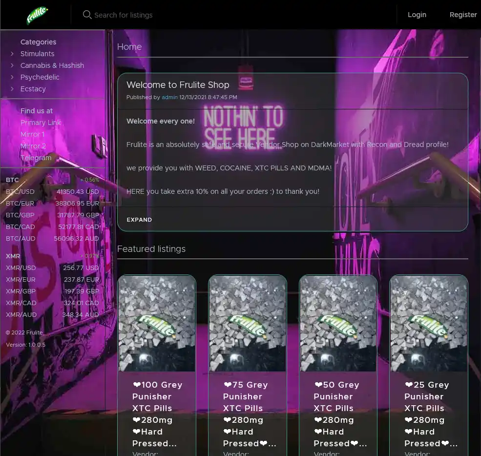 Frulite is a vendor shop offering drugs and medication of all kinds. While it is mostly focused on weed, cocaine, ecstasy and MDMA, you can find various other drugs on this site as well. Unlike most shops, you do not need to create an account to browse the market, so you can instantly take a look around before deciding to sign up. Registration of course is necessary if you want to purchase any products: You will have to charge your wallet first, the accepted currencies for that at the moment are Bitcoin and Monero.