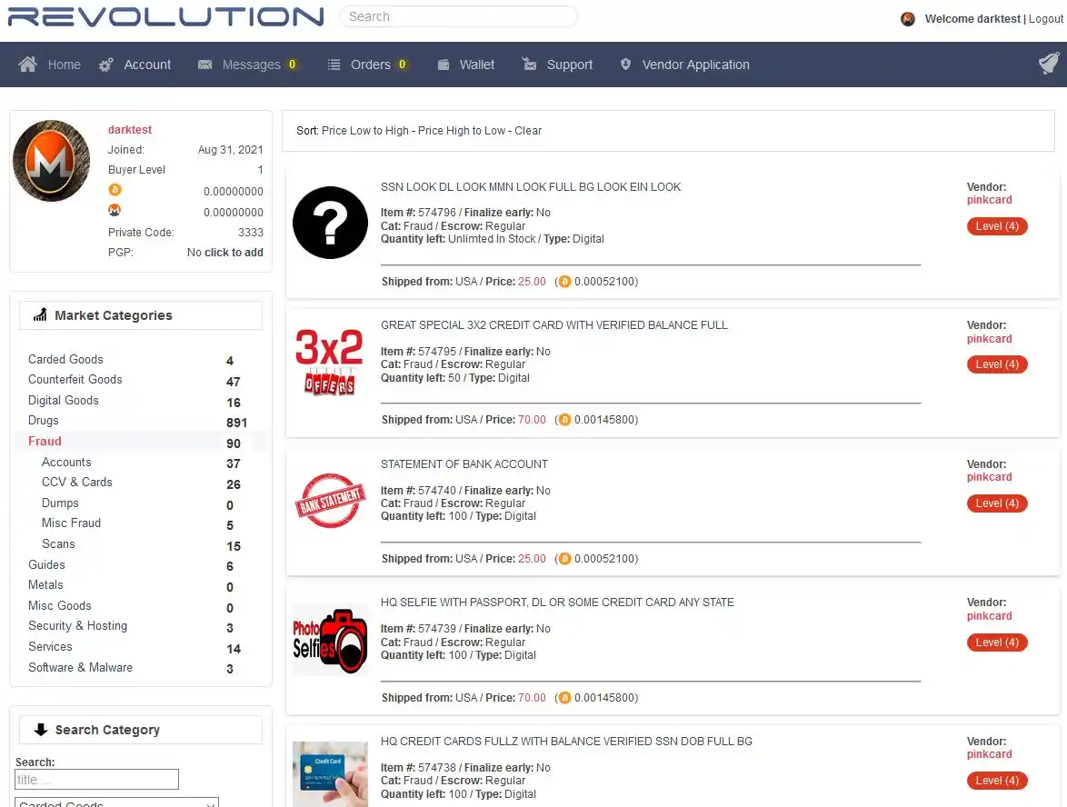 Revolution Market is a relatively new market that offers various categories of items. Next to the typical drug categories you will find digital items, fraud related goods, software, carded goods and counterfeit items. Accepted currencies are Bitcoin and Monero although Revolution intends to move to Monero excluively:
