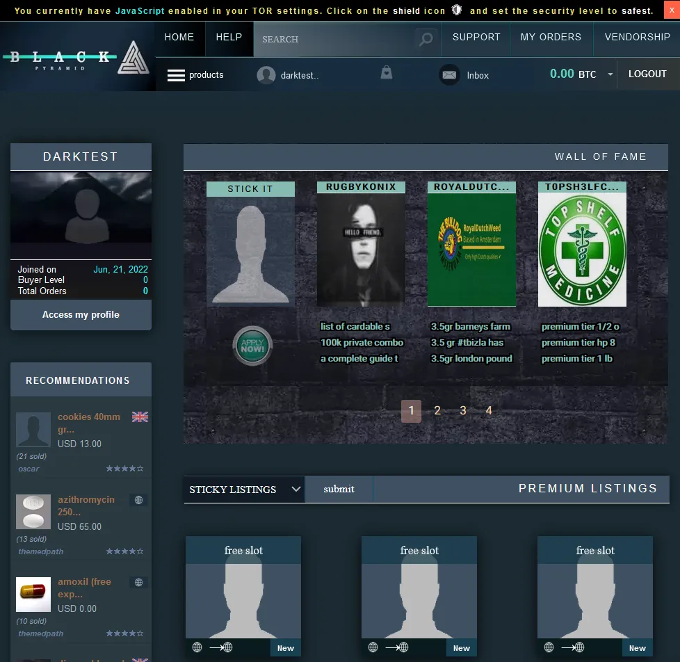 BlackPyramid is a great market site if you’re looking for a new all-purpose market. While the captcha can be irritating, the site navigation is simple and easy once you got passed that. BlackPyramid also offers vendorship if you are interested in selling on the platform. Vendor Bond and service fees apply but you have the option to pay these later from your vendor balance. As always, when visiting any darknet site or telegram group sure to only use trusted links, such as the onion link for BlackPyramid on the top.