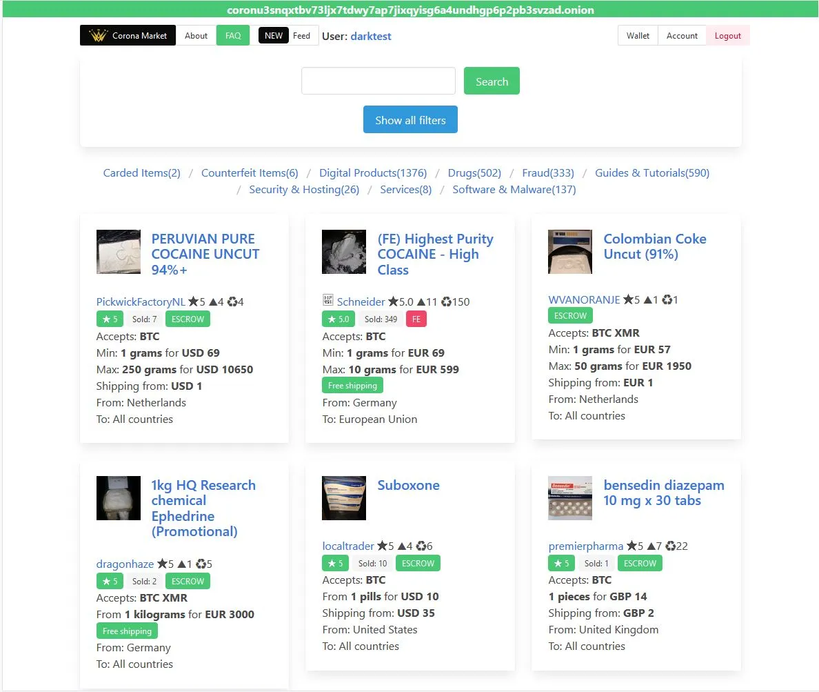 Corona is a general purpose darknet market with a great variety of different products. Next to drugs and medication you will also find software, exploits and all kinds of other products. If the market site is up, you can find the onion link for Corona Market to the right of this article.