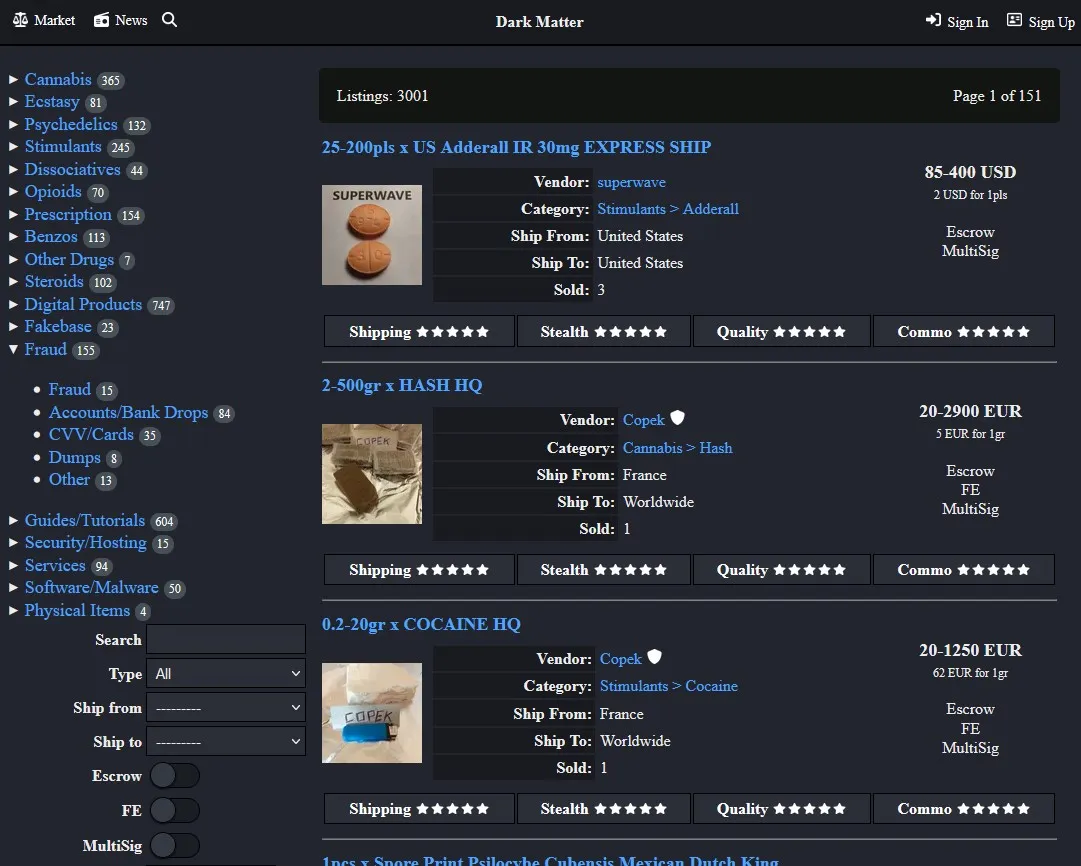 Dark Matter market, even though it is relatively new is already one of the markets with the largest product offerings. Whether you look for Drugs (cannabis, psychedelics, stimulants, opioids, benzos, etc) or any kind of digital items, ranging from fraud related listings, guides and tutorials, malware or security and hosting related offers, Dark Matter market is a great place to browse and shop. As always, when visiting any darknet market make sure to only use trusted links, such as the onion link for Abacus Market on the top right.