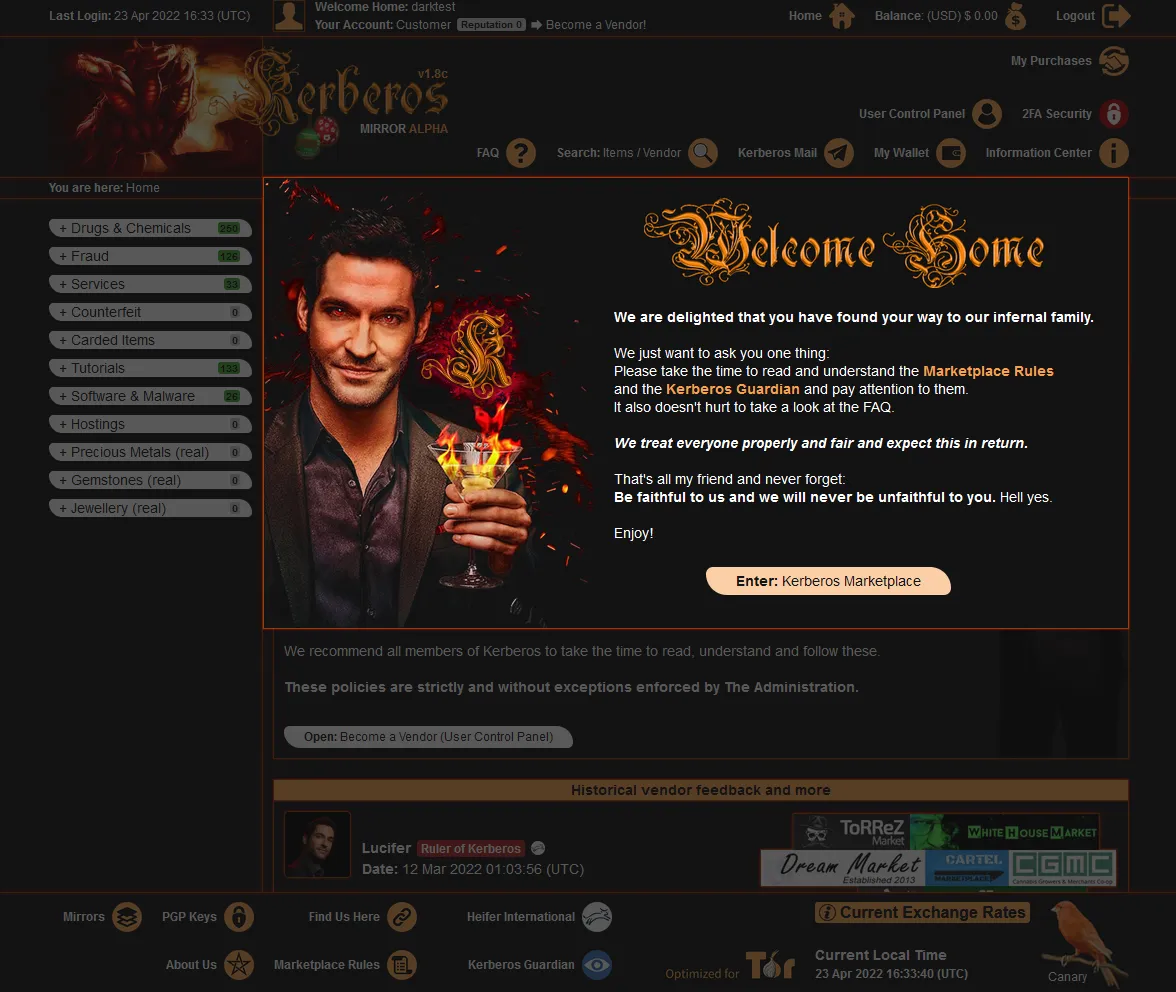 Kerberos Market is a relatively new market that offers various categories of items. Next to the typical drug categories you will find digital items, jewelery and gems, software, carded goods, counterfeit items and various services. Accepted currencies are Bitcoin and Monero and like on most markets, you will need to charge your wallet befor you can make any purchases.